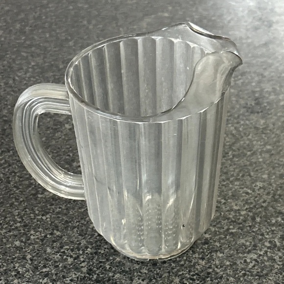 Elegant clear glass pitcher with ribbed design. Perfect for serving beverages.