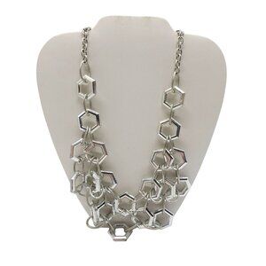 This bold statement necklace features silver-tone hexagonal links, designed to elevate professional and evening looks with its striking geometric design.