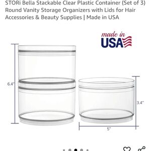 Set of three clear plastic containers. Ideal for organizing accessories. Includes colorful hair ties and clips.