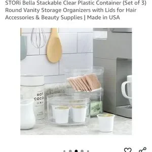 Set of three clear plastic containers. Ideal for organizing accessories. Includes colorful hair ties and clips.