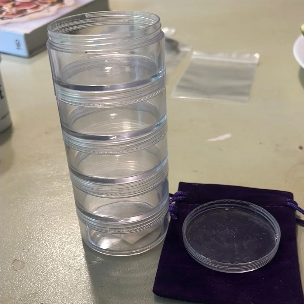 Set of clear stackable storage containers. Perfect for organizing small items. Comes with a lid