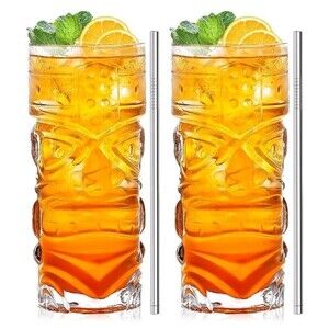 Clear Tiki Glasses Set of 2 - 14 Oz Cocktail Highball Glasses With Straws