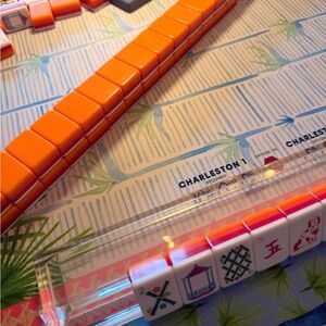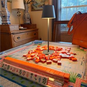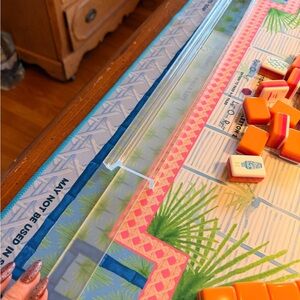 Clear acrylic mahjong or rummy tile racks with detached pushers. Pushers slider under racks for storage when not in use. Used 2 or 3 times. Great condition! 16” wide