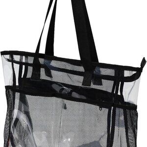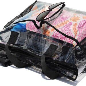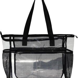 This clear tote bag is perfect for anyone needing a spacious, stylish, and compliant bag for stadiums, beaches, or travel adventures. The large capacity measures 19 x 6 x 14 inches, offering plenty of room for essentials with multiple pockets. It features 2 big front pockets, 2 deep side mesh pockets, and a large back zipper pocket — so your belongings stay organized and accessible. Made from waterproof PVC, it feels sturdy and durable, ideal for outdoor use and easy to clean with a damp cloth. The strong nylon shoulder strap makes carrying heavy loads comfortable. Whether you’re heading to a game, the beach, or the gym, this transparent tote helps you breeze through security and stay organized on the go. The sleek black design with mesh pockets adds a modern touch. Perfect for stadiums, concerts, work, or travel. Ships quickly from a smoke-free home. Bundle & save on multiple items!