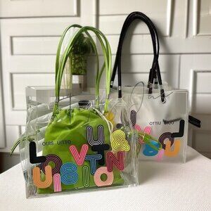 NOT BRANDED!!! GENERIC!!! This stylish clear tote bag features a white drawstring pouch, combining functionality and trendiness. The colorful lettering adds a playful touch, making it a standout accessory. Its spacious design ensures you can carry essentials with ease, perfect for casual outings or adding a pop of color to your ensemble.