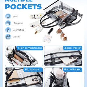Features: Spacious, transparent PVC tote with a sturdy design made from durable 0.5mm thick plastic. It has a large main compartment perfect for carrying your essentials like a tablet, wallet, sunglasses, and more. Comes with an inner zipper pocket, mesh water bottle holder, and card slots for extra organization. The dual carrying options include a stylish leather handle and a detachable, adjustable woven guitar strap for crossbody or shoulder wear. The reinforced bottom keeps the bag sturdy, and the smooth zipper allows quick access.