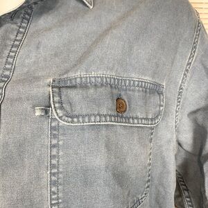 Clear Water Outfitters men’s light blue chambray button up outdoor work shirt. Button cuffs and southwest design inside collar. Perfect for hiking and camping. Excellent condition. Size Large.