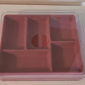 Stylish storage box with clear lid. Features multiple compartments. Perfect for organizing small items. It ia approximately 8 inches by 9 inches.