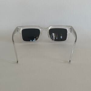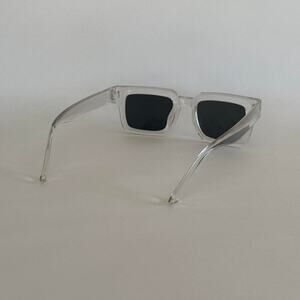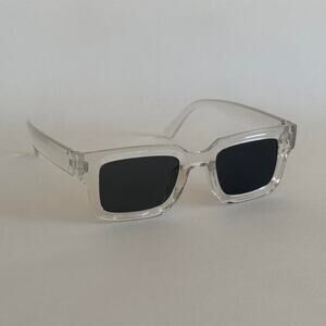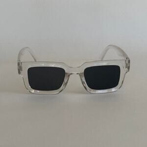 Unisex sunglasses featuring a bold square shape with clear frames and dark black lenses