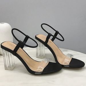 Brand new boutique item! Gorgeous Clear/Black sandals with about a 3 inch block heel and elastic ankle strap. Perfect shoes for any outfit. Extremely comfortable and true to size fit of 7.5
