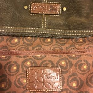 Dark green fossil handbag. Measurements are: width is 10 1/2 inches, height is 12 inches, side is 4 inches and handle is 45 inches. It's clean from inside, material is like a suede material and in the last picture U can see markings on the material. Please see pictures. Price is firm.
