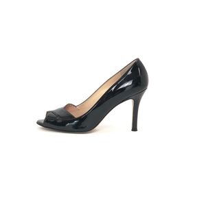 Kate Spade New York Gwennie Peep Toe Pump in black with patent leather, open toe crisscross design, leather upper lining and sole, and 3 inch heel.