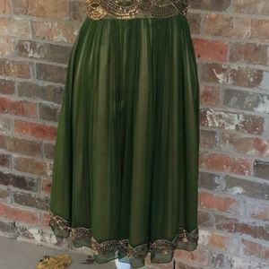 Beautiful Adrianna Papell Evening Beaded Dress! Green 100% Silk flowing dress with gold sequins & beads that cover the neckline, waist, and hem. Has 3 layers under the green silk dress, including petticoat. Pre-owned but very good condition. A few tiny snags here and there that were too small to even show up in photos. Not noticeable when worn. Recently dry cleaned. Last pic of me at a masquerade party, beaded shawl and accessories not included.