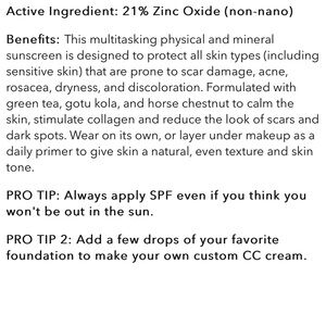 * Provides broad-spectrum sun protection, Lightly mattifying finish, Calms inflammation, Stimulates collagen-production, Doubles as a soothing primer with a blurring effect, and Sweat and water-resistant for 90 minutes. Airless Pump.