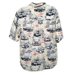 This Clearwater Outfitters men’s button-down shirt in size Large features a fun vintage truck and palm tree beach print, perfect for summer, vacation, resort, or tropical wear. Crafted from a breathable cotton/rayon blend, this shirt is lightweight and ideal for warm weather. Great for casual outings, BBQs, cruises, or as an aloha-style camp shirt.