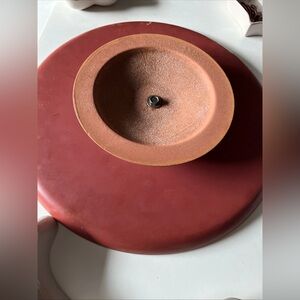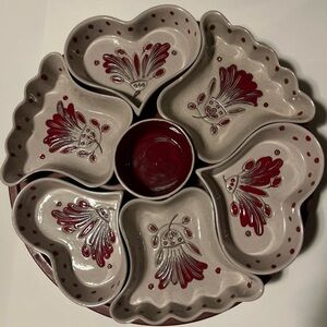 This is a complete lazy susan serving set with the original wooden turntable. An exaggerated heart shape dish is about 7" wide, 5-1/2" deep. It alternates on the lazy susan with a fan shape dish. This dish is about 7" across the wide portion, 6" deep. The sides of both shapes are 1-1/2" high. The round center bowl is 3-3/4" across, and just a little higher than the surrounding bowls. Each dish is marked with the Cleminson's Pottery Galagray green hallmark. The wooden turntable is stained a brick red. It is 16" edge to edge, with about a 1/2" raised rim to hold the serving bowls in place. It is about 2-3/8" high. The top surface has some light scuffing from the bowls - no scratches, chips, or splits. This 8 piece set is in exceptionally nice condition. Two of the dishes have minor chips, shown in photos.
