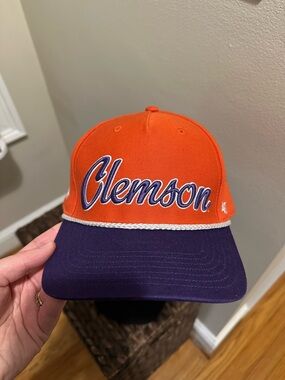 Classic script Clemson cap in bright orange crown and deep purple bill. White rope trim and contrast embroidery. Sporty collegiate style.