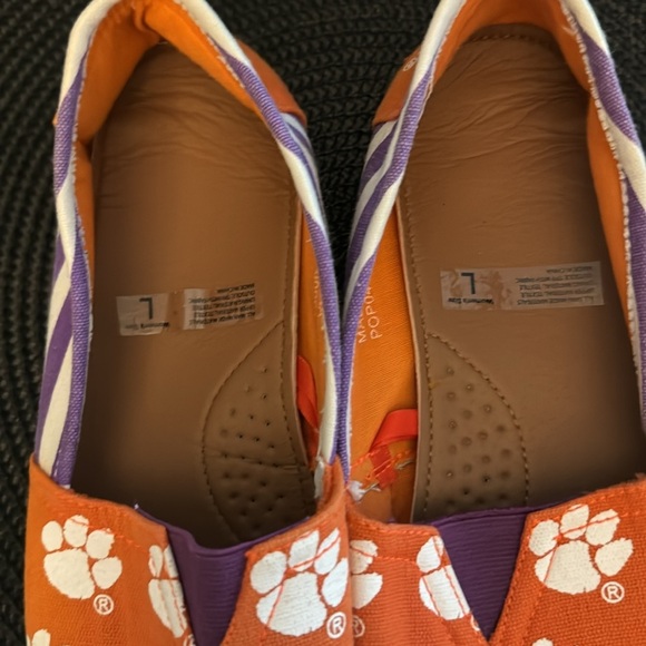 Very good condition Clemson Tigers canvas Toms-like slip on shoes. Women’s size Large (fits like 8-9). Insides look brand new! Measures 10” long. Such a cute shoe and perfect for that Tiger fan! From non-smoking home.