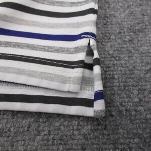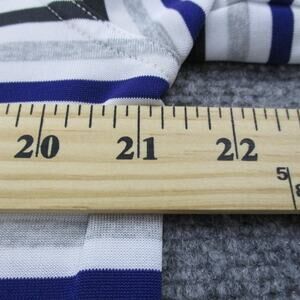 Color/Pattern: White, gray, black, and blue horizontal stripes with orange team logo