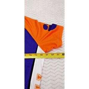 The Clemson Tigers XL Cycling Jersey in orange, white, and purple is perfect for any unisex adult looking to show their support for their favorite college team while cycling in style. Made of polyester jersey fabric, this short sleeve top features a full zip closure and convenient pockets for storing essentials. With a regular fit and reflective accents, this jersey is ideal for summer, fall, and spring rides. Represent the Tigers with this comfortable and stylish cycling jersey.