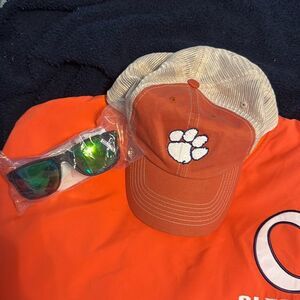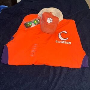 Clemson Pullover jacket NWOT. C & Clemson stitched on chest of pullover. Pockets on side as shown in pics. No flaws or wear as NWOT. Hat included with Clemson paw print stitched. NWT shades included