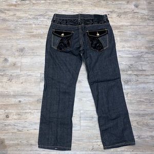 Clench Black Denim Mens Jeans, Designer Back Pockets Trim In Gold Tone Stitching,Sz W36”X L33” Good Condition See All Pictures For Details (PREOWNED