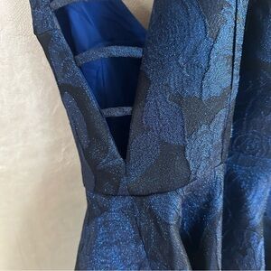The Cleo dress is a captivating blue mini designed for cocktail occasions, featuring a sleeveless style with elegant spaghetti straps and a v-neckline. Its fit and flare silhouette is accentuated by a defined waist and a flared skirt, creating a graceful and stylish appearance. The luxurious fabric, with its subtle sheen and intricate pattern, adds a sophisticated touch to any special event.
