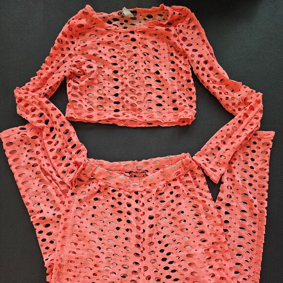 Cleo neon matching set. Long sleeved top, matching pants, cut out, elastic waist. This didn't very stretchy and doesnt have much give.