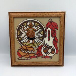 Heavy stoneware tiles, handmade, hand painted and glazed/fired in Sante Fe, New Mexico sometime in the 1980s by Cleo Teissedre. Each tile is frames in wood and measures 9x9 inches square. Ready to hang. Excellent condition with NO chips, cracks or damage.