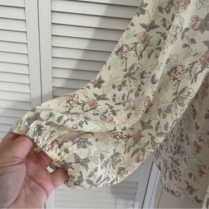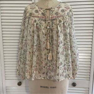 Cleobella peasant/boho style top, 100% cotton, cream/gray/pink floral print, shell buttons all the way up front, tassel ties @ neck, elastic hem sleeves, side seam slits. Beautiful and flowy. Freshly dry cleaned. Great condition 😊