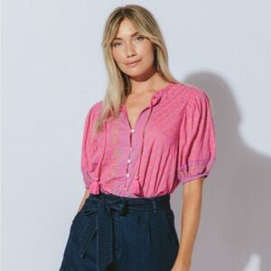 Cleobella Amari Blouse Ditzy Mix Block Print Pink Organic Cotton Balloon Sleeve