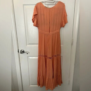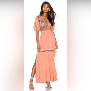 For our pretty Parisian babe, the Amery Dress is made from soft flowing fabric. With a low back and beautiful floral embroidery, the Amery Dress is made for sunlit strolls along the sea. Crinkle rayon maxi dress Mesh and embroidery detailing Button closure with peek a boo opening at back Model is wearing size Small 60in length, 31in bust