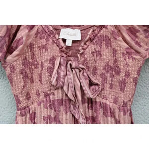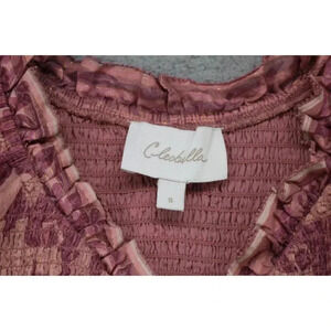 This is a Cleobella Organic Cotton Midi Dress that is a size Small. It has a Batik pattern and a tiered ruffle at the bottom. It has gold threads running throughout the dress. It has short flutter sleeves. It ties in the front and has a smocked stretchy bodice to fit. It is 95% Organic Cotton and 5% Metallic. Laying flat, it measures: Armpit to armpit-16" and the length is 46.5". It is in great condition.
