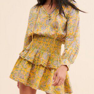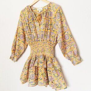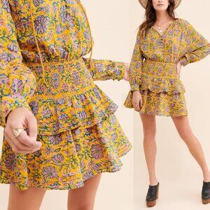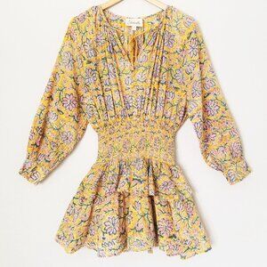 Cleobella Bianca Mini Dress S Yellow Combo $208 Tiered Ruffle Smocked Waist Boho