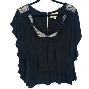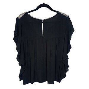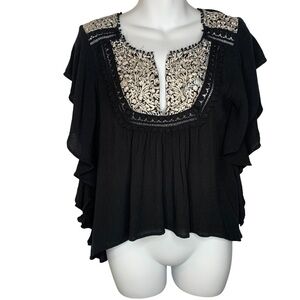 Cleobella Black Flutter Sleeve Blouse with White Floral Embroidery Size XS