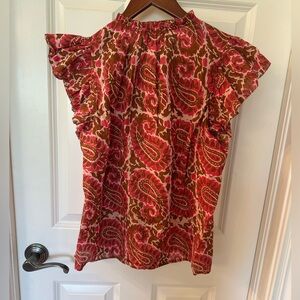 Chic red floral blouse with ruffle sleeves. Perfect for casual outings.
