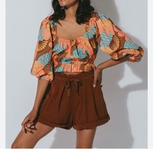 Cleobella Vibrant floral top with puff sleeves. Features orange, blue, and brown hues.