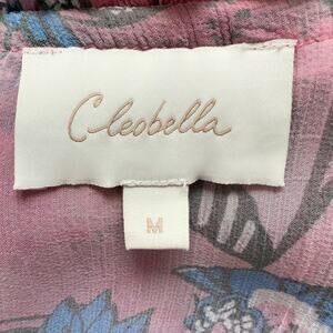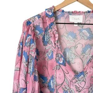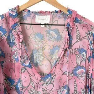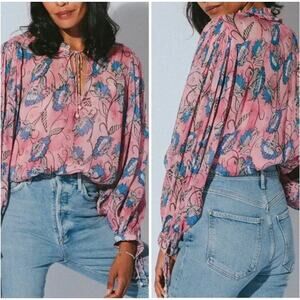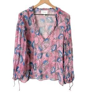 Cleobella Emily Sheer Blouse In Pink Blue Lotus Floral Print Blouson Sleeves, M