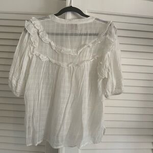 Chic ivory blouse with delicate ruffles. Lightweight and stylish. 100% cotton. 27” pit to pit. Excellent condition. Reach out with questions.