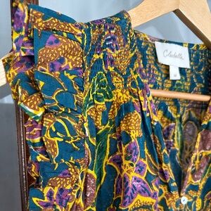 Cleobella Organic 100% Cotton Blue Yellow Floral Sleeveless Blouse Medium Boho, peasant, designer, bohemian, full button front