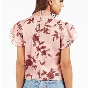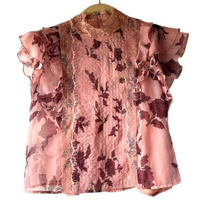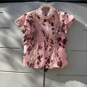 Elegant pink blouse with floral design. Features ruffled sleeves and high neckline. Perfect for casual or dressy occasions.