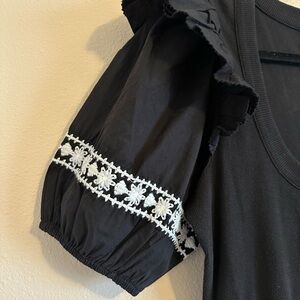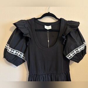 Chic black midi dress with ruffle sleeves. Features white embroidered details. Perfect for versatile styling. New with tags! Perfect condition! All details on dress are in pictures. There is one little thread a little bit out, in the last picture.