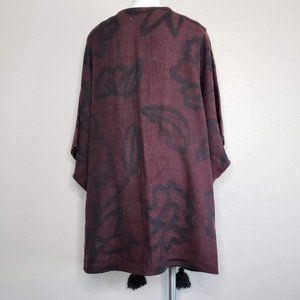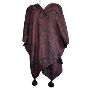 This luxe draped knitwear features corner tassels and a gorgeous floral print in bordeaux & black.