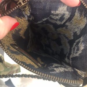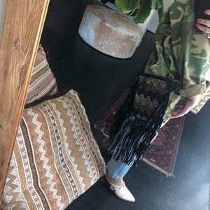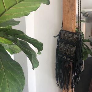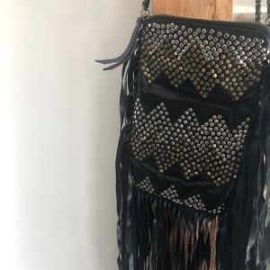 This is a genuine Cleobella small black leather crossbody with silver and gold stud detailing and a removable chain strap. The interior of the bag is lined with Bali Ikat fabric.