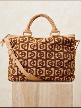 Stylish tan and brown patterned tote with braided top handles and an adjustable crossbody strap. Soft textured exterior and secure zip closure. Versatile design for everyday use. Includes tan leather accents for a refined look.