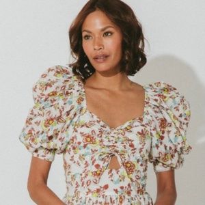 Size xs but tie in back allows it to be adjustable. Smocked detailing