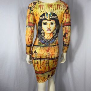 Make a bold, art-inspired statement in this rare Good Time USA Cleopatra dress, featuring an iconic Egyptian queen portrait print across the front and ancient hieroglyphic art throughout. Crafted from a smooth stretch poly-blend, this figure-hugging bodycon silhouette celebrates powerful feminine energy with an exotic vintage aesthetic. Large