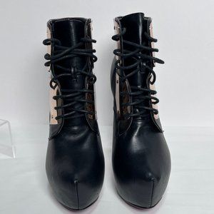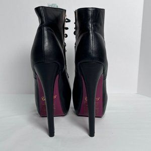 Cleopatra Magda. Platform booties with stiletto heel. All black lace up with faux gold plate accent on front. 6 inch heel, 3 inch platform. Pink bottoms. Heels have minimal to no wear.