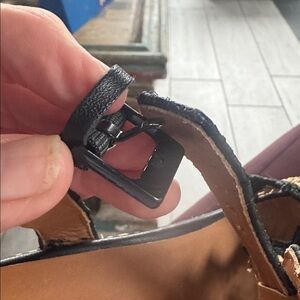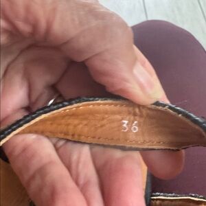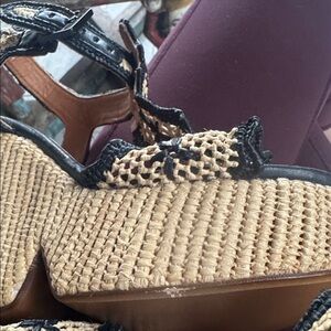 Shoes are like new. Only been worn putting them on and walked on carpet. Too high for me and too small so I pulled the thing that you can see in the last photo so I broke it. So it’s missing on one shoe. Can take them to a shoe place and they can put a new one in for you. Cream colored with black