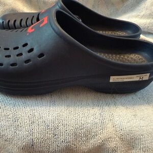 Comfortable black slip-on clogs featuring bold red lettering on top. Well loved condition